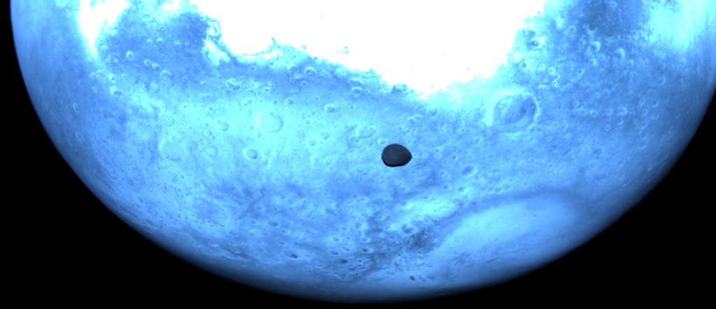 Osservando Marte sullo sfondo si può osservare la chiarissima regione Terra Sabaea prossima all’equatore, il grande cratere Huygen di 450 chilometri di diametro appena sotto a destra e il cratere Schiaparelli a sinistra. In basso a destra è ben visibile il bacino Hellas, che con i suoi 2.300 chilometri di diametro e sette di profondità, è uno dei più grandi crateri da impatto noti nel Sistema solare.