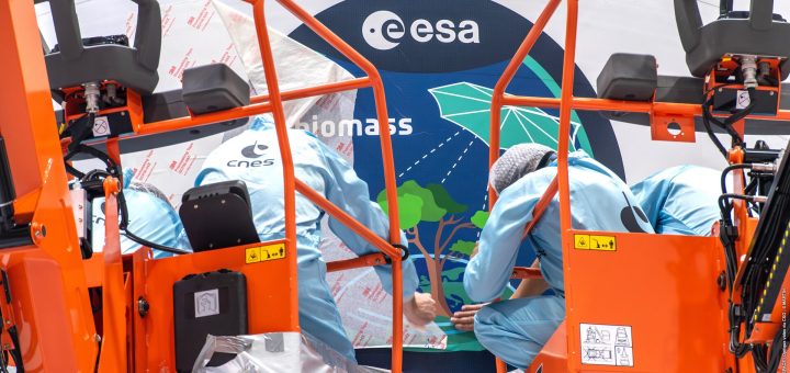 In questa immagine i tecnici stanno applicando l'adesivo della missione Biomass sulla carenatura del vettore. Credits: ESA-CNES-ARIANESPACE/Optique vidéo du CSG–S. Martin
