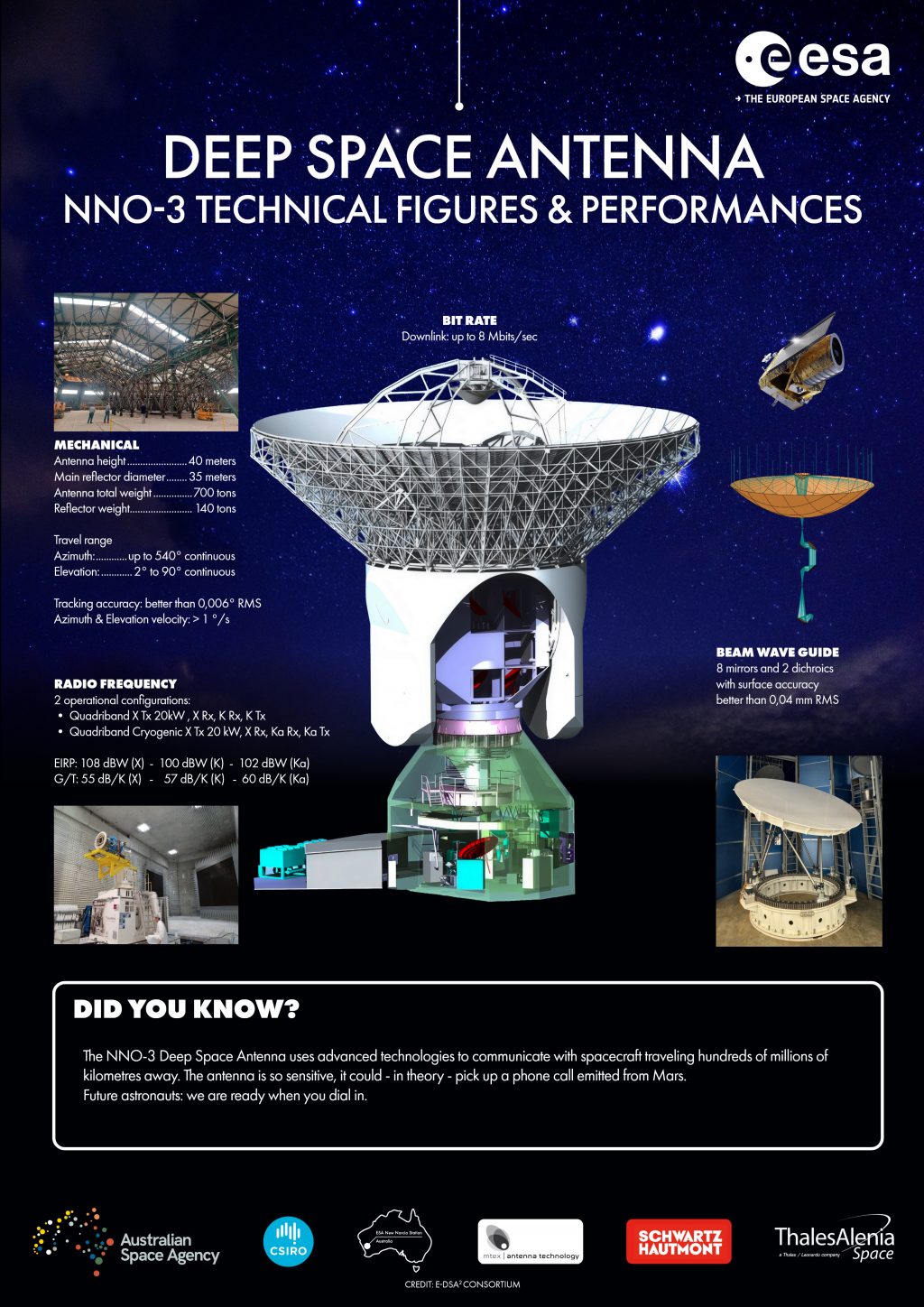 Situata a New Norcia, circa 115 chilometri a nord di Perth nell’Australia Occidentale, l’antenna New Norcia 3 (NNO3) soddisferà la necessità sempre crescente dell’agenzia. Poter disporre di capacità di ricezione dati ad alta velocità è il cardine per rafforzare l’indipendenza e la leadership europea.